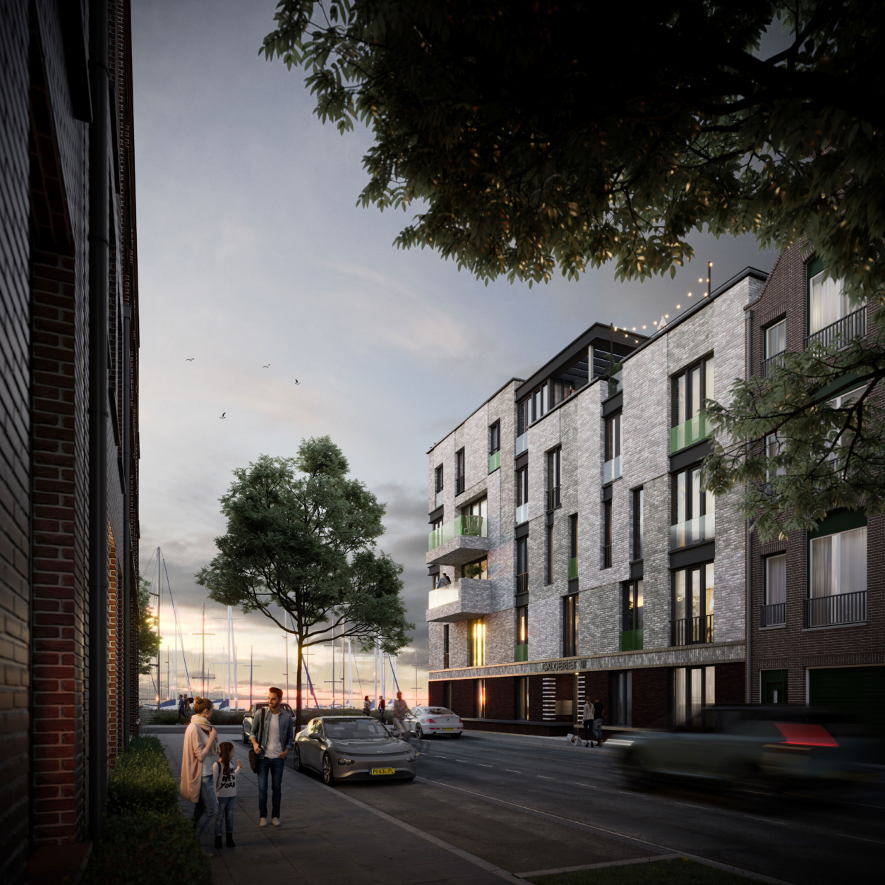 Als sluitstuk van deelfase 1 staat het appartementengebouw met 16 koopwoningen als een rots in de branding op een markante plek in het stedenbouwkundige plan. Vanuit het water markeert het blok als een baken de noordwestelijk hoek van het havenbassin. Vanuit de wijk staat het op het kruispunt van de hoofdtoegangsweg voor autoverkeer en de langzaam-